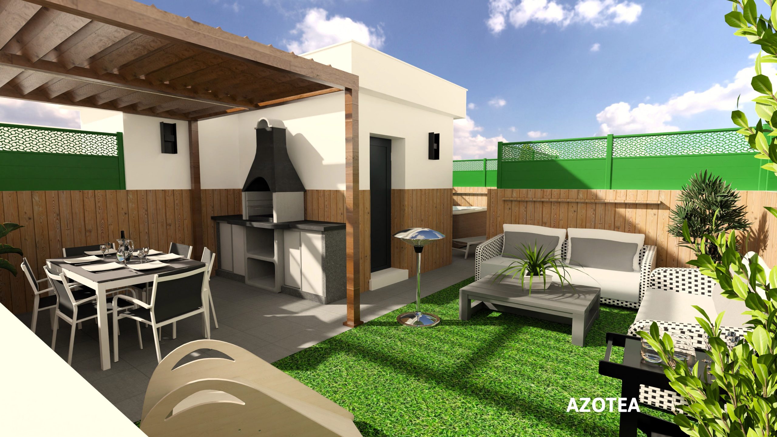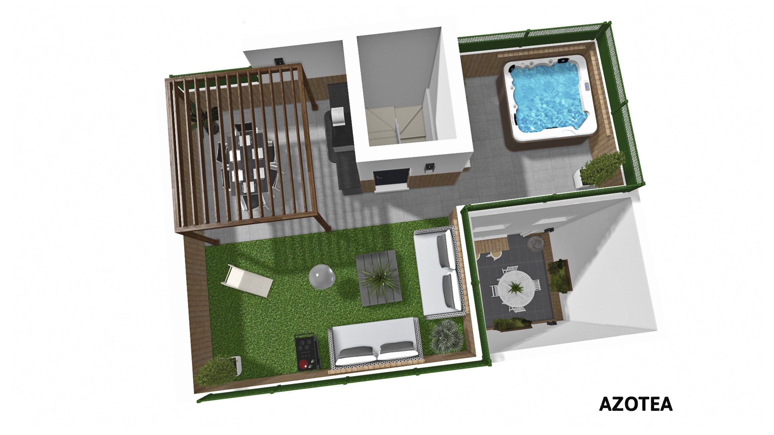*La pérgola y la barandilla mostradas en la azotea son elementos decorativos.
